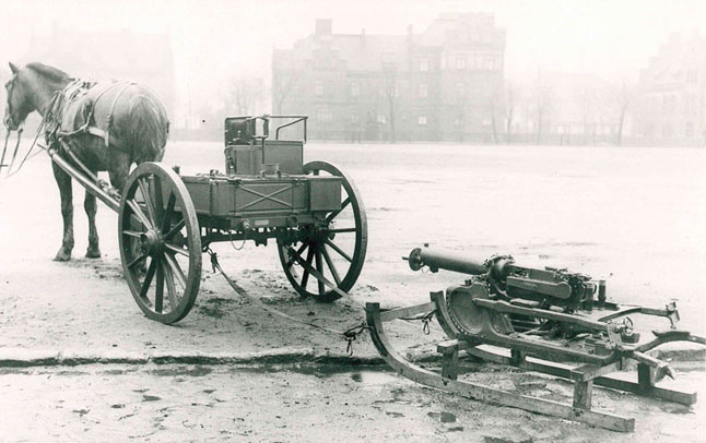 KULKOSVAIDIS. Sunkusis tarpukario Lietuvos kariuomenės kulkosvaidis MG08. Tolumoje matyti dabartinis Klaipėdos universiteto rektorato pastatas.