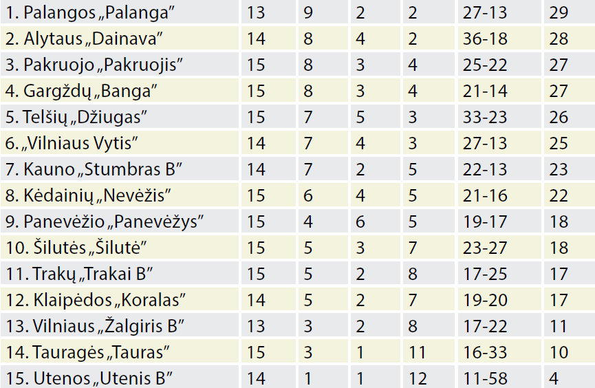 Šiuo metu pirmosios lygos turnyrinė lentelė atrodo taip (vieta, komanda, rungtynės, pergalės, lygiosios, pralaimėjimai, įvarčiai ir taškai):