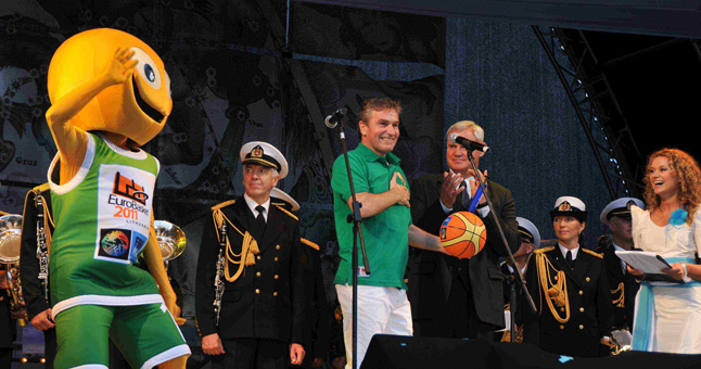 PRADŽIA. Lietuvos krepšinio federacijos viceprezidentas Rimantas Cibauskas (su kamuoliu) susirinkusiai žmonių miniai penktadienį pranešė džiugią naujieną: "Klaipėdai yra dovanojami krepšinio kamuoliai, belieka juos prisipūsti". Pirmasis kamuolį pripūtė Klaipėdos meras Vytautas Grubliauskas.