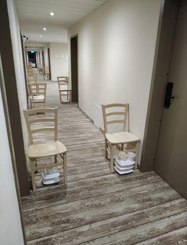 MAISTO PRISTATYMAS. Stengiantis išlaikyti fizinį atstumą, maistas kiekvienam "burbulo" dalyviui į kambarį yra pristatomas bekontakčiu būdu.