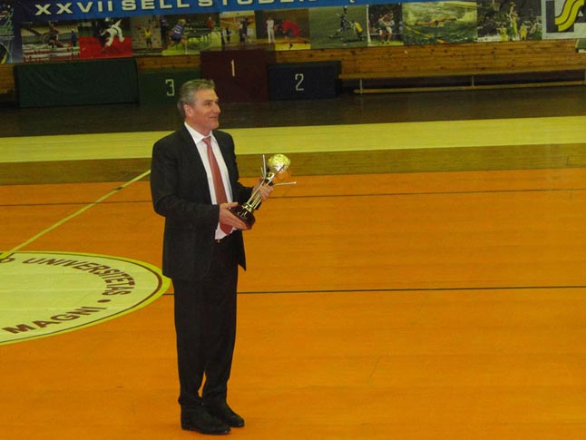TAURĖ. LSKL prezidentas klaipėdietis Rimantas Cibauskas Kaune prieš dvikovą tarp VDU ir MRU įteikė reguliaraus čempionato nugalėtojų taurę MRU ekipai.