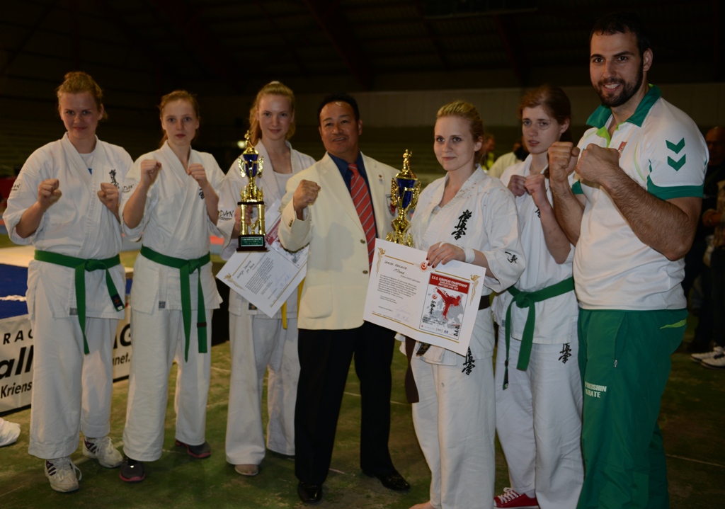 Shodan merginos su Pasaulinės federacijos prezidentu Pasaulio čempionu Kenji Midori.