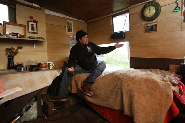 Išsiskyręs su drauge bedarbis Merfis tapo benamiu, tad per šią vasarą laukuose Pievų gatvėje, greta čia esančių kitų lūšnų, pasistatė sau trobesį. Vyras čia yra įsirengęs ir krosnelę, kad nesušaltų žiemą.