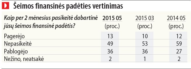 Per paskutinius 2 mėnesius (lyginant su 2015 m. kovo mėnesio tyrimu) gyventojų nuomonė šiuo klausimu nesikeitė, o lyginant su vertinimais prieš metus 6 procentiniais punktais sumažėjo manančių, kad reikalai šalyje gerėja. 2014 metų gegužę situacijos gerėjimą matė 42 proc. gyventojų.