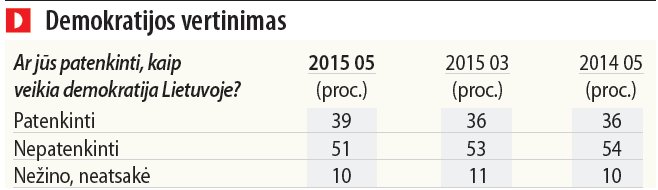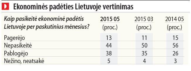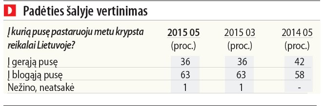Naujienų agentūros ELTA užsakymu gegužės 23 - 31 dienomis rinkos ir viešosios nuomonės tyrimų bendrovės "Baltijos tyrimai" atliktos apklausos duomenimis, gegužės mėnesį 36 proc. apklaustų 15 metų ir vyresnių Lietuvos gyventojų atsakė, kad pastaruoju metu reikalai Lietuvoje iš esmės krypsta į blogąją pusę, o šeši iš dešimties arba 63 proc. respondentų manė, kad reikalai šalyje gerėja. 1 proc. respondentų neturėjo nuomonės šiuo klausimu.