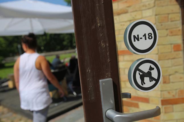 STOP. Tėvelių patogumui kai kurios kavinės jau prie įėjimo informuoja, kokia publika čia nepageidaujama. Egidijaus JANKAUSKO nuotr.