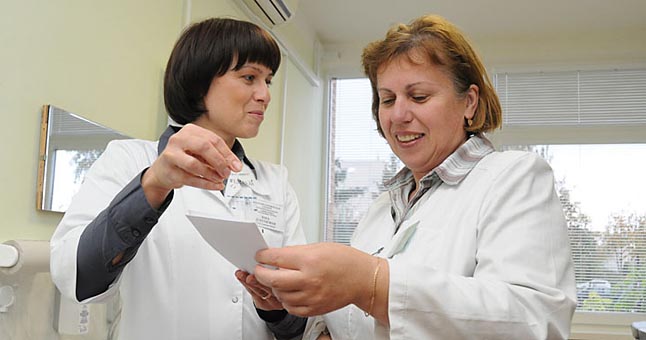 | Biochemijos skyriuje elektroforezės metodu atliekama daug sudėtingų tyrimų. (Iš kairės) skyriaus vedėja medicinos biologė Rasa Jurevičienė ir medicinos biologė Vilija Venckienė aptaria tyrimų rezultatus. |