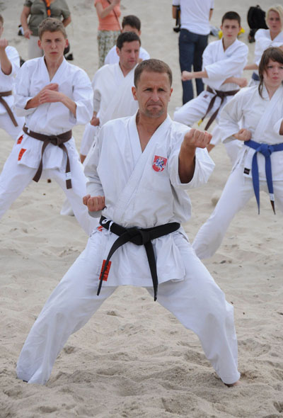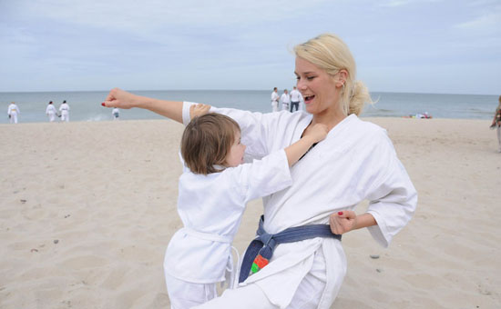 | Vilnietė Mantė į seminarą atsivežė trejų metų sūnelį Džiugą, kuris treniravosi vienoje gretoje su karatė meistrais, o kai pabosdavo, pritūpdavo pasikapstyti smėlyje. |