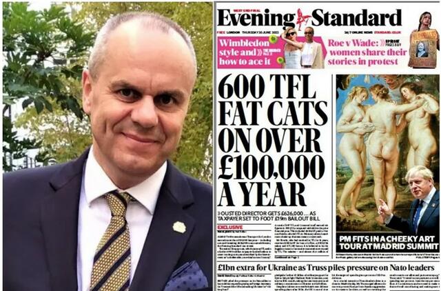 Nuotraukoje: Evening Standard šios dienos pirmasis puslapis atskleidžia „riebių TfL katinų“ atlyginimus.