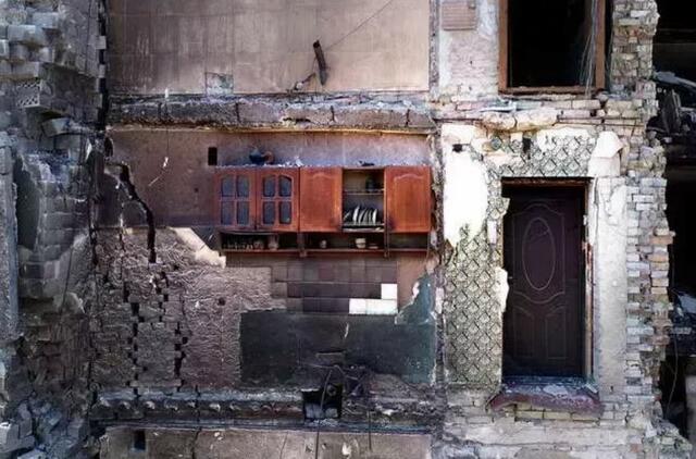 Virtuvės atributika ant visiškai subombarduoto namo sienos tapo vienu iš pasipriešinimo masiniams rusų okupantų nusikaltimams simbolių, pranešė muziejus.