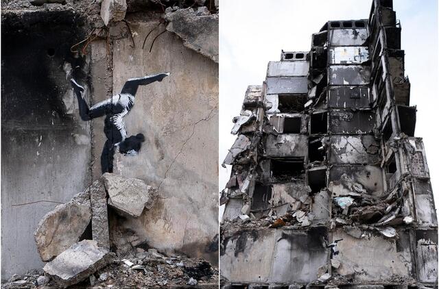 Penktadienio vakarą visame pasaulyje žinomas grafičių menininkas socialiniame tinkle „Instagram“ paskelbė tris meno kūrinio – gimnastės, stovinčios ant vienos rankos, ant sunaikinto pastato griuvėsių Borodiankos mieste į šiaurės vakarus nuo Ukrainos sostinės Kyjivo – nuotraukas.
