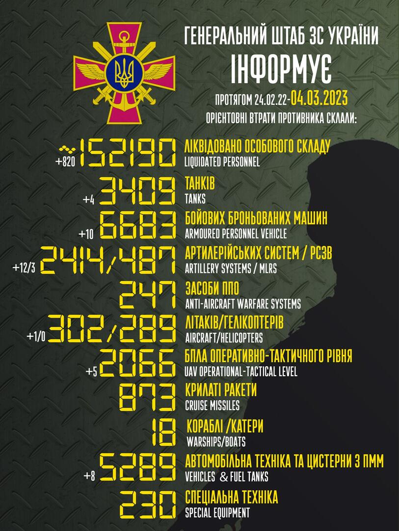 Ukrainos kariškiai pastarąją parą sunaikino dar 820 okupantų rusų. O iš viso nuo 2022 metų vasario 24 d. iki 2023 metų kovo 4 d. Rusijos armija Ukrainoje jau neteko apie 152 190 kareivių.