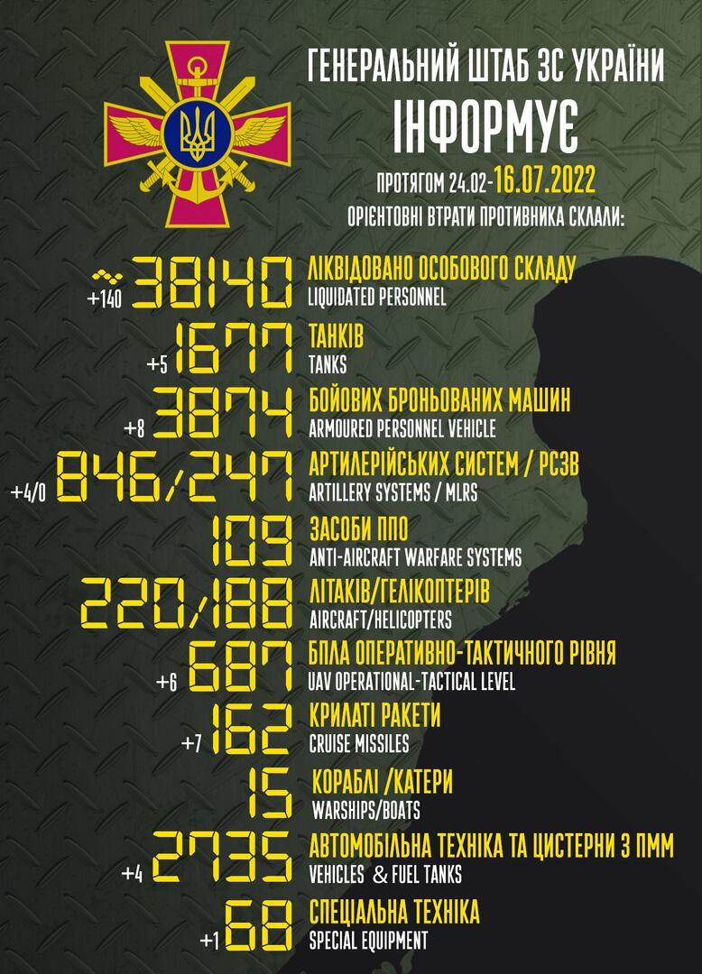 Štabo duomenimis, nuo vasario 24 dienos iki liepos 16-osios Rusija taip pat neteko 1 677 tankų, 3 874 šarvuotųjų kovos mašinų, 846 artilerijos sistemų, 247 daugkartinio paleidimo raketų sistemų, 109 oro gynybos sistemų, 220 lėktuvų, 188 sraigtasparnių, 2 735 transporto priemonės ir degalų cisternos, 15 laivų, 687 dronų, 68 specialiosios technikos vienetų ir 162 sparnuotųjų raketų.