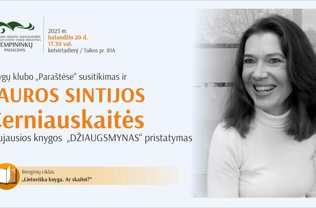 Balandžio 20 d., ketvirtadienį, 17.30 val., Klaipėdos m. sav. Imanuelio Kanto viešosios bibliotekos Pempininkų padalinyje (Taikos pr. 81A) vyks susitikimas su prozininke, dramaturge, vienuolikos knygų autore ir šešių literatūros premijų laureate Laura Sintija Černiauskaite.