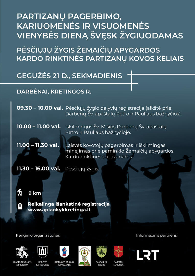 Žygio dalyvių lauks kariškos vaišės bei kiškio kopūstų sriuba, pagaminta pagal autentišką partizanų receptą, o žygį vainikuos partizanų dainų festivalis, kurį surengs Kretingos rajono Darbėnų gimnazijos moksleiviai.