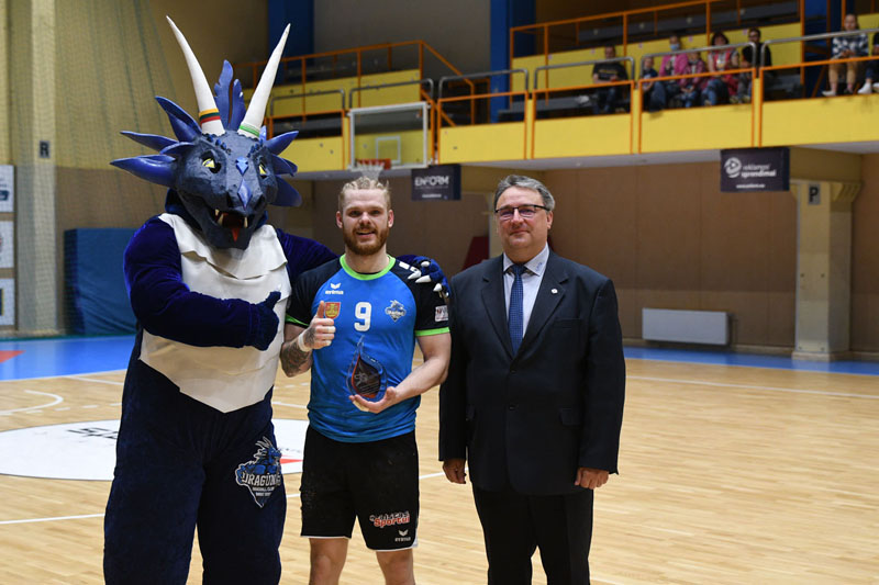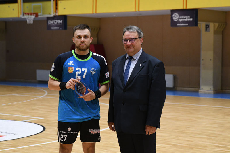 APDOVANOJO. Geriausiu Lietuvos rankinio lygos sezono linijos žaidėju buvo išrinktas Benas Butkus. RK „Dragūnas“ nuotr.