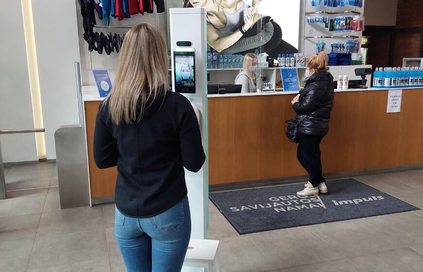 SAUGUMAS. Į sporto klubą „Impuls“ atėję klientai visų pirma turi pasimatuoti kūno temperatūrą. Be to, patalpose ir rūbinėje privalu dėvėti kaukes.