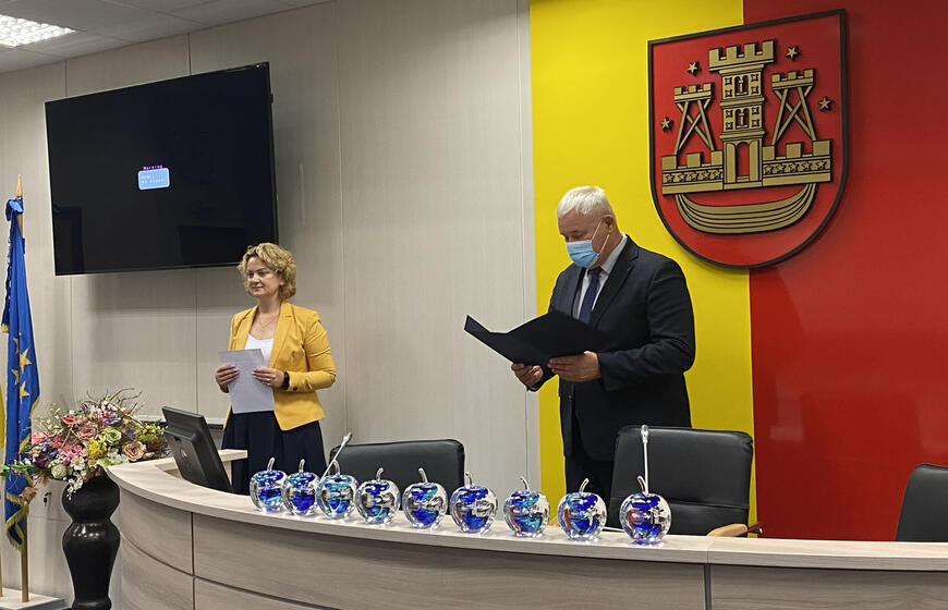 Agnė Černeckytė gavo stiklinį obuolį iš Klaipėdos mero Vytauto Grubliausko rankų.