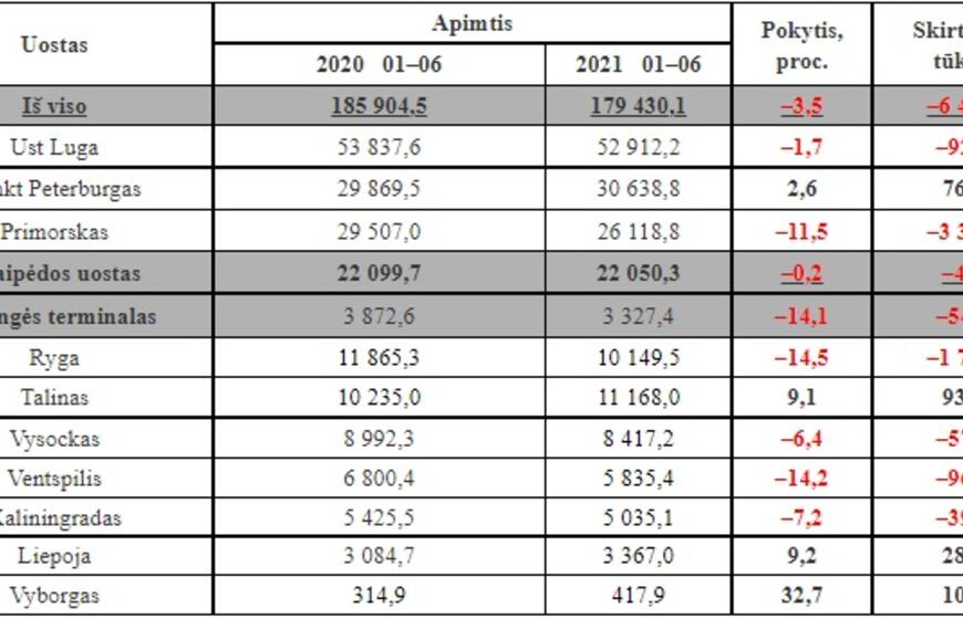 2021 m. sausio–birželio mėn. į Klaipėdos uostą atplaukė 3 214 laivų, tai 3,6 proc. arba 112 laivų daugiau, apsilankė 74 012 keleivių, tai yra 18,8 proc. arba 17 080 keleivių mažiau nei 2020 m. sausio–birželio mėn.