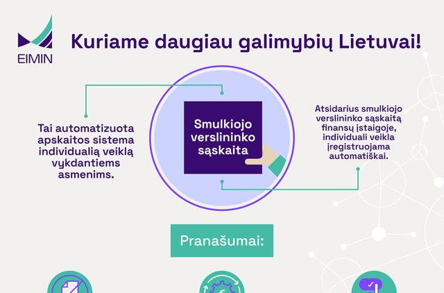 Kitąmet Lietuvoje pradės veikti smulkiojo verslininko sąskaita, kuri palengvins veiklą savarankiškai dirbantiesiems. Ji kuriama remiantis gerąja užsienio šalių patirtimi ir atsižvelgus į individualią veiklą vykdančių asmenų poreikius - numatoma automatizuoti finansų tvarkymą. Kaip rodo atlikta apklausa, net 75 proc. apklaustų savarankiškai dirbančių asmenų pasinaudotų šia priemone.