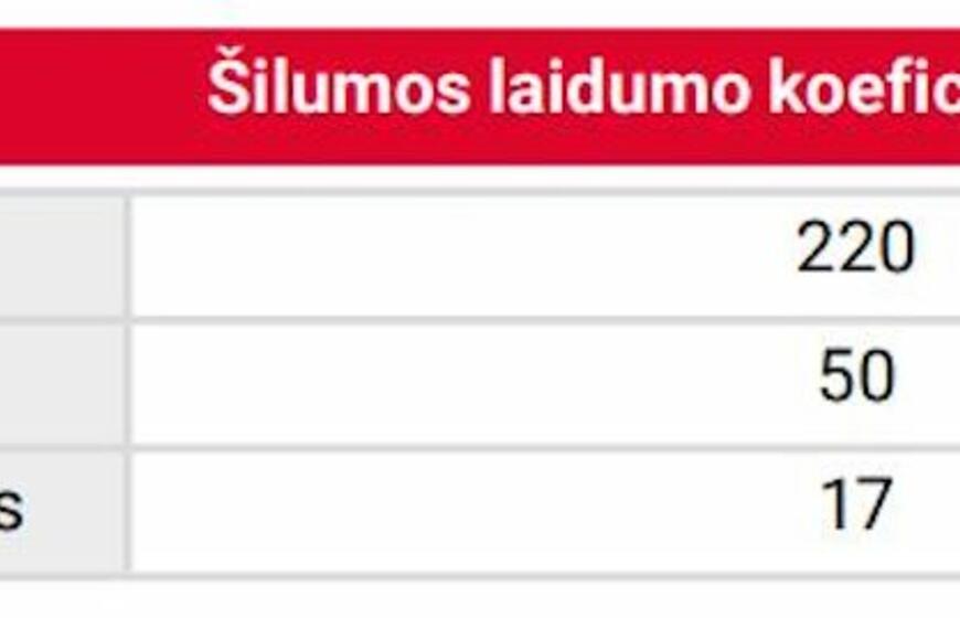 - pateikiamos šilumos izoliacijos charakteristikos ir lentelės, kuriose pagal reikiamą pasiekti šilumos perdavimo koeficiento vertę, nustatomas izoliacijos storis,