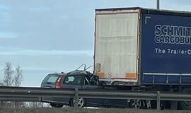 „Volvo" palindo po vilkiko puspriekabe: vairuotojas šansų išgyventi neturėjo